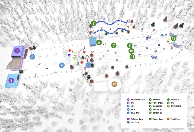 평창 휘닉스파크 눈썰매장은 전국 눈썰매장 TOP 10 안에 꼽힐 정도로 놀이시설이 잘 되어 있어요. 튜브 썰매존 3개, 패밀리 썰매 존, 봅슬레이 썰매, 키즈 썰매장 등이 시설이 다양하게 마련돼 있어 아이들은 물론이고 성인까지, 온 가족이 액티비티를 즐기기에 좋답니다😁