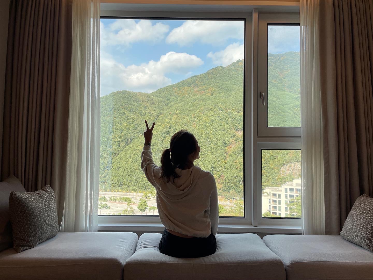산속뷰,,,는 사실 잘 안보임 바로옆에서 숙소 안이 보일 것 같아 커튼치고 있었음 이건 아쉽