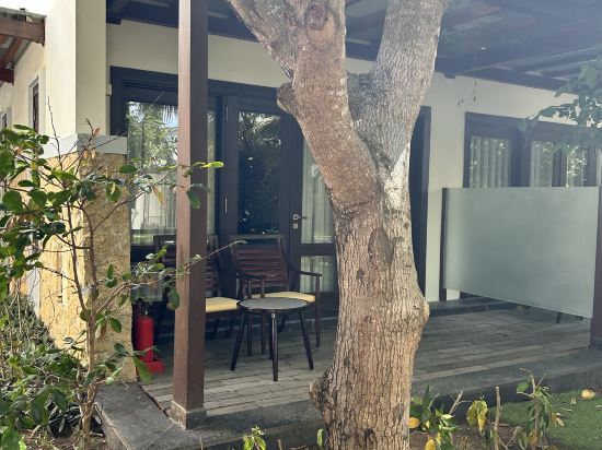 Заселение без проблем, мы приехали на час раньше. Оформление быстрое,далее отвезли в номер- номер называется премиум- это в домиках на территории. В нем есть небольшая терраса и располагается он в саду. В интерьере много дерева, кондиционер прекрасно работает и есть еще вентилятор на потолке, что очень удобно. Очень удобно жить в домике- сразу из сада попадаешь в дом (ранее жили в этом отеле в номере в корпусе). Очень большая ванная комната, полотенца белоснежные. Кровать очень удобная- матрас прекрасный, белье белоснежное. На террасе можно сушить вещи и посидеть на стульчиках за столиком.