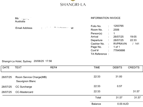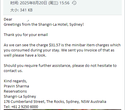 현금으로 현금을 사용하여 가능한 한 현금을 사용할 수 있다고 경고합니다. 이전 호텔에서 현금을 사용해도 괜찮습니다. 마지막 호텔은 Shangri-La를 예약했습니다. 프론트 데스크는 보증금이 CASH 인 경우 AUD600, 카드를 스 와이프하고 AUD200, 카드를 쉽게 스 와이프하기 위해 중국으로 돌아온 후 신용 카드를 받았습니다. AUD31, 호텔에 확인하기 위해 이메일을 보냈는데 호텔에서 청구서를 주었고 미니 바의 백주를 사용했다고 말했습니다. 아이들과 나는 작은 냉장고에 물건을 옮기지 않았고 아이들은 술을 마시지 않았습니다.