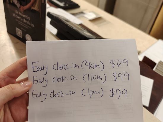 체크인을 한 사람은 정말 역겨워했습니다. 아시아 인은 영어를 말했습니다. 3 시간 전에 12시 이상 도착했기 때문에 일찍 체크인 할 수 있는지 물었습니다. 음, 그리고 사람들은 손으로 작성했습니다. 얼리 체크인 가격표 (사진)는 얼리 체크인을 제공하지 않을 수 있습니다. 그러나 객실 요금을 이미 지불 한 손님에게 시간당 객실 가격을 강요 할 수 없습니다. 전 세계에서 놀지 마십시오. 기본 객실이 좋으면 일찍 체크인 할 수 있습니다. 나는 또한 에어 비앤비를 열었습니다. 슈퍼 집주인은 편리합니다. 사전에 리셉션을 받게됩니다. 처음으로 조기 체크인 정책을 손으로 쓴 것을 보았습니다 (◍•ᴗ•◍). 모두 번개 피하고 xhs를 검색 할 수 있습니다.이 호텔은 훌륭한 서비스입니다.