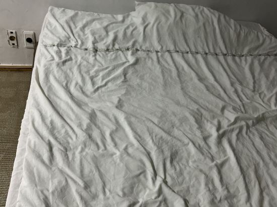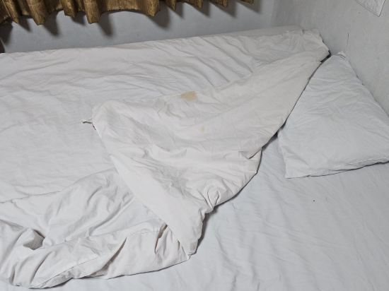 3. 하도 오래 사용해서 낡아서 닳고 찍어진 매트리스 사진인데, 저 위에 아주 얇은 천 하나가 깔려있어서, 다이소에서 비닐커튼 하나 사서 메트리스를 덮고 이불 위에서 잤어요. 다행히도 냉방이 되지 않아 이불은 덮을 필요가 없더군요.