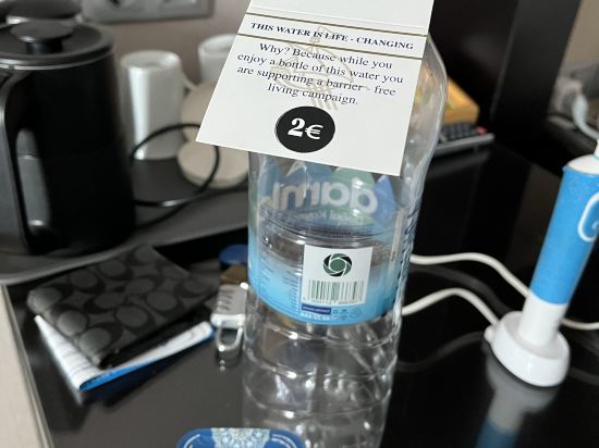 # 가장 불만족스러운 것은 물 배달입니다. 그림과 같이 큰 병의 물은 2 유로입니다. 뒷문을 나와 좌회전 후 바로 우회전하여 물을 살 수있는 작은 상점이 있습니다. 물을 사러 거기에 가십시오.