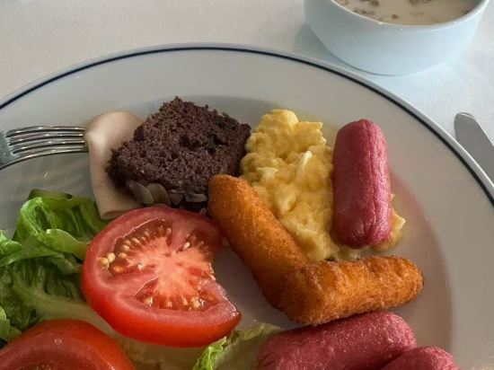 #아침 식사는 말하기 어렵고 맛이 없습니다. 과일은 신선합니다. 먹을 것이 없습니다.