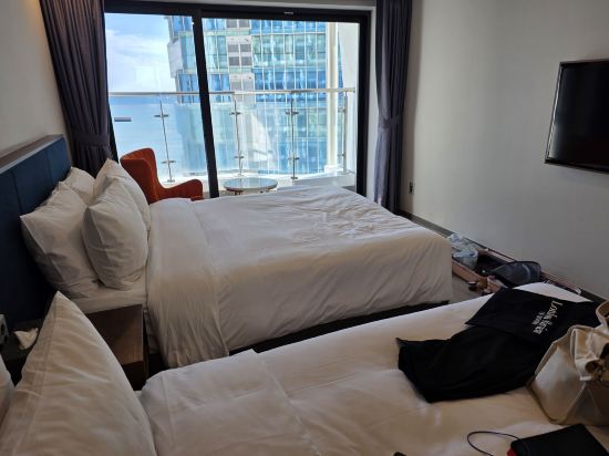 호텔측에 요청한대로 25층 중 23층 방을 주셨는데 사진과 다르게 베란다 유리가 불투명 유리에 높아서 침대에 눕거나 앉거나 의자에 앉아서도 바다가 안보여요...