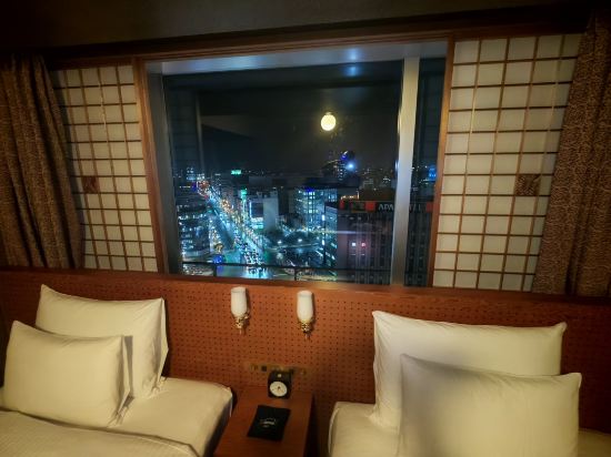 이 호텔은 오이타 역 위에 있습니다. 다른 방보다 넓은 슈페리어 트윈 룸을 예약했습니다. 바닥 모퉁이에는 창문과 문이 있습니다.