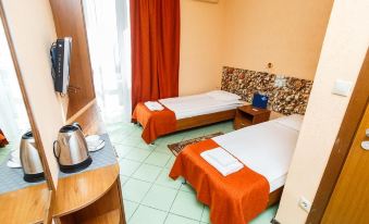 Либо я избалована, либо хорошие отзывы фейковые. Кроме места - прямо напротив пляжа и набора в номере: тв, холодильник, фен, кондей, преимуществ нет. Жили там три дня в 2х номерах: 1. Трехместный: окно под крышей крохотное, подушки чисто символические, в санузле плесень, сантехника не чищена. Заселили на 30 мин позже, даже не извинились: «у нас 12 выездов сегодня, горничная не успевает». Ощущение что ты везде им обязан. 2. Переселили в «улучшенный номер»: номер маленький, розетка для холодильника и тв одна - выбирай сам чему работать, плесень на стенах, вида из окна нет: 2/3 затянуто виноградом, так что свет не проходит, в остальную часть видно хоз.двор - свалку велосипедов и стоянку грязных квардриков. Территории у гостиницы НЕТ: даже места администратора нет - она сидит в пристроечке к другой гостиннице из профилей пвх. Детская площадка - это один домик и тренажер, на который нельзя садится детям. Как бы на 2* тянет (если б не плесень), НО почему цена как у нормальных трешек с питанием на соседних улицах?!?!