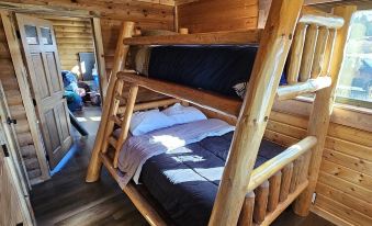 The Chalet sleeps 7 people. The bedroom off the main floor sleeps three on an Amish built bunk bed with a full on the bottom and twin on the top. The windows have great views of the Mount Haggin wilderness area. Here you will also find a stacked full laundry setup in one of the closets. The second closet has some shelving and a place to hang your garments.