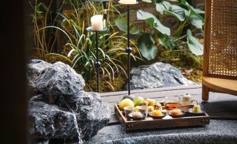 환경: 일본식 인테리어와 정원, 안개 속 푸른 언덕, 천연 목욕탕, 캐리어 이동 도움 등 편안한 분위기 제공.(97개 리뷰 기준)