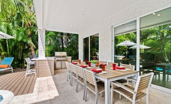 One of the many exclusive amenities that sets Beach à la Mode apart is its resort-style private heated pool and spa.The pool area is beautifully landscaped, providing a serene and private oasis where you can relax, sunbathe on the loungers, or enjoy poolside dining at the outdoor dining area. In addition to the pool and spa, this home also features a canal front location with a rooftop lookout. The rooftop lookout offers incredible water views, providing a picturesque setting for sunsets, stargazing, or simply enjoying the panoramic views of the island.