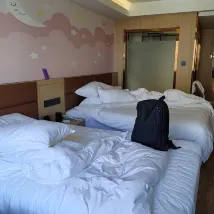 리처드 콘서트를 보러 왔어요. 방은 크기도 적당하고 넓었고, 인테리어도 새로 했어요. 무료 업그레이드도 받았고요. 더운 여름에도 시원하고 편안했어요. 더블 침대와 싱글 침대가 있었어요. 저녁에는 야식도 제공되었는데, 꽤 맛있었어요.
