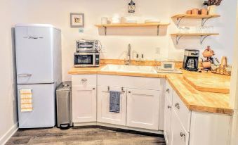 Enjoy your own private suite with a living area, dining area, kitchenette, bedroom, and private bath. The kitchenette features a sink, fridge, coffee maker, electric kettle, toaster oven, and microwave, along with dishes and silverware. Start your morning off right with a selection of tea and locally roasted coffee. The fridge is stocked with local beer.