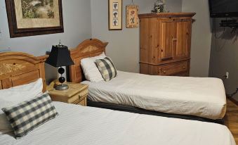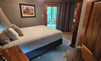 The queen-sized bedroom and twin bedroom is located downstairs on the lower level of the cabin with full bath.