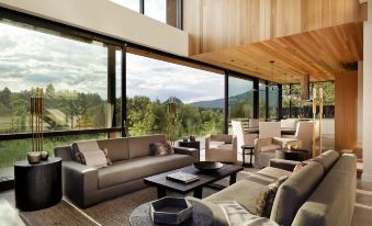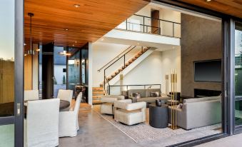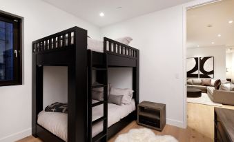 The residence features 5 bedroom, 5 1/2 bath home and is the perfect modern chalet for a large family or a group that likes space. Every bedroom has ensuite bathroom. Home features three dramatic master suites with sitting areas and the main Master Bedroom has a large covered deck, and large walk-in closet. This home has a double ceiling height great room and an additional living room on the floor below providing enough space for the entire group! Both living rooms feature a 77 inch OLED TVS. The second living room/theater features a poker game table for ultimate fun. The open plan living area provides a fully stocked kitchen with Caesarstone countertops, imported Mosa Dutch tiles and Bosch appliances. There are radiant heated concrete and wide-planked oak floors throughout the home. Enjoy the indoor and outdoor gas fireplaces with a push of a button. This residence is features all new furnishings and accessories by Restoration Hardware.