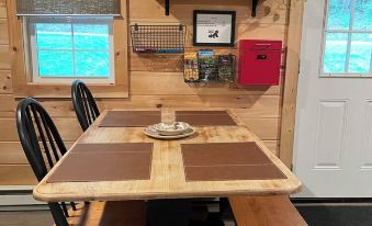 The Cabin ambiance continues into the Kitchenette and Dining area with the outdoorsy décor, the wood look of cabinets, butcher block countertops, the wood chairs, and dining table.