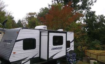 Our Conquest 2018, 19 foot camper is nestled in the rear of a main home in a fenced in backyard.