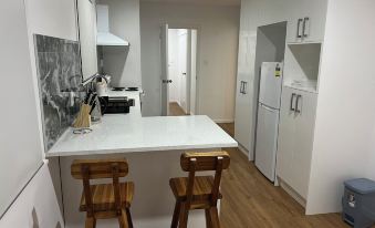 Open plan kitchen with two bar stools.