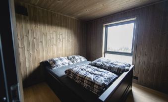 The cabin is equipped with modern comforts such as a heat pump, underfloor heating, and a fireplace for cozy evenings. You'll also find all the necessary kitchen appliances, an outdoor fire pit, and comfortable outdoor furniture for relaxing in the fresh mountain air.