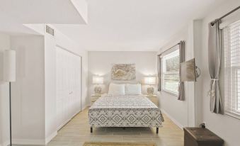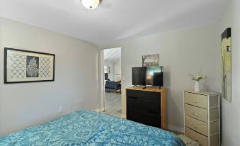 The master bedroom features a plush bed and a TV for ultimate relaxation. The open-concept living area includes a large couch, a big-screen TV with Roku, and multiple streaming services.