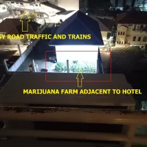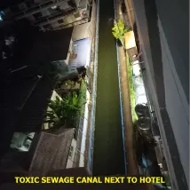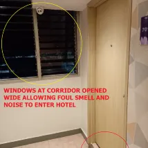 호텔 바로 옆에 불법 ********* 농장이 있고 호텔 바로 옆에 약 1m 떨어진 곳에 매운 찌꺼기가 있는 하수관이 있습니다. ********* 농장과 하수관에서 나오는 강한 독성 악취가 발코니와 틈새가 있는 슬라이딩 창문, 문 아래에 넓은 틈새가 있는 객실 문에서 방으로 들어옵니다. 객실 복도 창문은 활짝 열려 있었습니다.