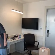 리뷰를 많이 봤습니다. 그래서 우리는 따라가서 아주 좋다고 말해야 했어요. 생각했던 것보다 낫습니다. 방은 넓고 딱 맞는 크기이며 아름답습니다. 게다가 TV를 켜서 무료로 시청할 수 있습니다. 침대 끝이 아닌 침대 옆에 누워서 잘 볼 수 있습니다. 제가 정말 좋아하는 컬러 조명도 있어요. 계량 스테이션도 있습니다.