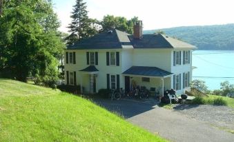 From our covered porch you can enjoy the ever-changing light off the lake. You can walk or bike the access road in front of our house, perhaps hiking up one of canyons into the hills above the lake, to some extraordinary waterfalls. You can walk or bike the trail that connects Keuka and Seneca Lakes. Or fish -- the area near our house is known as one of the best bass fishing areas in the Finger Lakes.