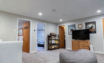 On the bottom floor, there is an additional living room with a full bathroom and 2 bedrooms with queen beds each.