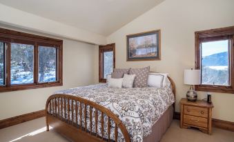 The Primary bedroom suite is a luxurious retreat with a king bed, gorgeous mountain views and a private bathroom featuring a jacuzzi bathtub and steam shower. This spacious second bedroom is furnished with a luxurious king-sized bed with an en-suite bathroom. The third guest bedroom is furnished with double. The lower-level bedrooms can be accessed by a private entrance. One is furnished with a set of twin beds and the other with a double bed, love seat and a kitchenette.