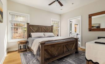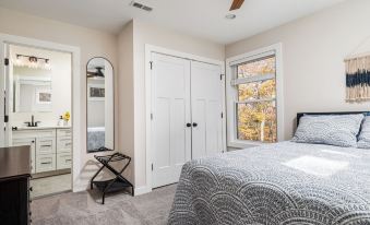 Sleeping Arrangements: The main-level primary suite features a plush king bed and a luxurious ensuite bathroom with a soaking tub, walk-in shower with bench, and double vanity. ✨ Enjoy your getaway without the hassle of packing a SlumberPod! Our crib with a Newton breathable mattress fits perfectly in the primary walk-in closet—complete with its own air vent. Close the door and voilà: your baby or toddler has their very own cozy bedroom oasis. 🍼🌙💤 Upstairs, two spacious queen bedrooms are connected by a Jack-and-Jill bathroom with a shower/tub combo- ideal for couples or friends. On the lower level, a fun bunk room includes a twin-over-full bunk bed and a rollaway single - great for kids or extra guests. A full bathroom with shower/tub combo is conveniently located just outside the room.