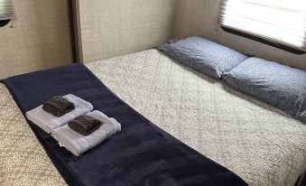 This TT had 2 bedrooms and 2 baths. It also had a ‘jackknife’ sofa in the living room area. Water pressure in 2nd bathroom shower wasn’t as good as the master bedroom shower. We brought our own towels, washcloths to use only because there was no washer dryer in the TT, however there is coin operated machines in the campground. Owner supplied bedding, towels, some toiletries dishes, pots and pans, silverware, etc. all the stuff you would need for your stay. Had a few hiccups during our stay but owner came right over and took care of issues. All n all a nice RV park, lots of permanent homes. Nice salt water pool. RV resort was close to several gas stations, restaurants and grocery stores.