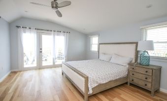 Master Bedroom – King-size bed, barn-door walk-in closet, flat-screen TV with Roku, and direct access to the upper deck with stunning bay views.