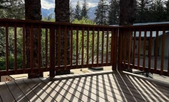 The charming front deck is a great place to enjoy a morning cup of joe and breathe in the scent of sun-warmed pines.