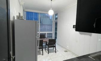 Fridge. Iron, iron-board and a dining table. It contains a large balcony as well for morning coffee.