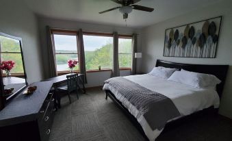 This rental is the primary rental of the house and is the lower level with its own private entrance. When rented as a one bedroom as in this listing, it will sleep 4(1 bedroom with King and sleeper sofa in living room). For additional rental space of this unit as a 3 bedroom, see the listing for The Sunrise House on Lake Ann Lower Level(3 bedroom). In addition there is an apartment for 2 people in the listing Sunrise House on Lake Ann Apartment. This space is an amazingly beautiful peaceful space to get away with 1 private bedrooms and 2 full baths, full kitchen with coffee bar, ping pong table, 65" tv, amazing deck with outdoor dining table and couches with fire table. All this on beautiful Lake Ann with its great fishing and amazing limestone cliffs. On the waterfront there is a firepit and multiple paddleboards and kayaks for your use(as well as pfds). Come cook smores on the fire by the lake or read a book on the covered deck looking out over the most peaceful views around!