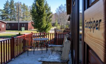 Cosy, comfortable chalet "Sandpiper Lodge", detached, surrounded by fields. On the outskirts, 2 km from the centre of Boat of Garten, 26 km from the skiing area. Private: patio, garden furniture. In the complex: washing machine (extra), tumble dryer (for shared use, extra). Parking at the house. Shop 2 km, supermarket 2 km, restaurant 2 km, bar 2 km, bus stop "Boat of garten" 2 km, railway station "Aviemore" 8 km. Nearby attractions: Cairngorm National Park, Highland Wildlife Park 23 km, Inverness 46 km, Landmark Adventure Forest Park 7 km, Highland Folk Museum 32 km. Well-known ski regions can easily be reached: Cairngorm Mountain 23 km, The Lecht Ski Centre 40 km. Well-known lakes can easily be reached: Loch Garten 1 km, Loch Morlich 18 km, Loch Ness 65 km. Please note: car recommended. Additional accommodations can be booked. 3-room chalet. Spacious and bright, tasteful and cosy furnishings: open living/dining room with dining table and TV (flat screen). Exit to the patio. 1 room with 1 double bed (1 x 135 cm, length 190 cm), shower/WC. 1 room with 2 beds (90 cm, length 190 cm). Open kitchen (oven, 4 gas rings, toaster, kettle, microwave, grill). Bath/shower/WC. Heating. Terrace furniture. Beautiful view of the countryside. Facilities: iron, children's high chair, baby cot for up to 2 year olds. Internet (WiFi, free). Parking. Please note: suitable for families. Non-smoking house. Smoke alarm.