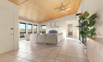 Inside, warm cedar ceilings create a cozy, soulful atmosphere. The kitchen offers pastoral hillside views and a chef-grade cooktop and oven, perfect for preparing meals that bring the whole family together.