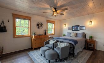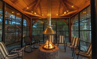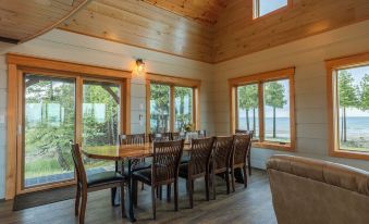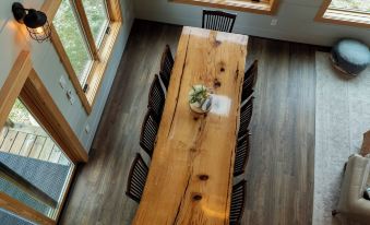 Constructed in 2021, the home features all-season construction with complete kitchen and laundry facilities. It comfortably sleeps 12 in its six full sized bedrooms. Three sofas and a loveseat can also serve as sleeping space and are particularly inviting for grandchildren. In addition, there is ample space in the loft and bedrooms for sleeping bags that are distant from foot traffic. With four and a half baths, and several eating areas, the home manages large groups of people effortlessly.