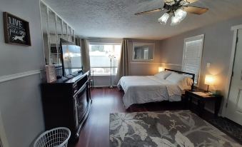 This quiet little place does not disappoint. It's right off the street but very quiet and relaxing. There are chairs out front to sit back and relax under the wonderful shade tree with all the flowers around. This place was perfect for our needs for the two of us. The only little thing was it did take awhile for the hot water to heat up in the shower and kitchen sink. This will not keep us from staying here again.