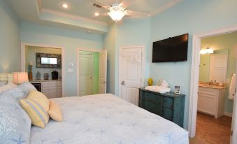 The primary bedroom upstairs has a king bed, coffee bar, wine fridge, and private deck to enjoy those perfect ocean sunrises and a cup of coffee . This bedroom has also has a smart TV. Attached is a spacious master bathroom with a large walk-in shower.