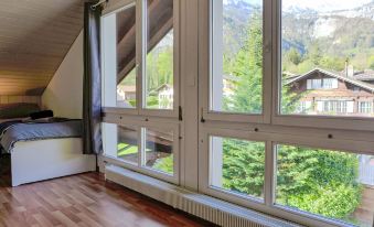 Brienz: Small apartment house, 3 storeys. In a sunny position on a slope, in the residential district, 400 m from the lake. In the house: table football, central heating system. Parking (for 2 cars) at the house. Grocery 200 m, supermarket 1.5 km, restaurant 250 m, bakery 200 m, bus stop 250 m, railway station "Brienz" 1.3 km, public bathing area 600 m. Golf course (18 hole) 25 km, walking paths from the house, cycle lane 10 m, mountain railway 1.5 km, skisport facilities 12 km, ski bus stop 250 m, ski school 12 km, sled run 15 km, cross country ski track 15 km. Nearby attractions: Freilichtmuseum Ballenberg, Brienzer Rothorn, Aareschlucht. Well-known ski regions can easily be reached: Meiringen - Hasliberg 15 km, Axalp 12 km. Well-known lakes can easily be reached: Brienzersee. Hiking paths: Brienzer Rothorn, Axalp, Rosenlaui. Groups of teenagers on request only. Please note: airfield close by. "Belvedere", 5-room maisonette 210 m2 on 2 levels, on the top floor, south-west facing position. Spacious and bright, very comfortable and cosy furnishings: open large dining room with panoramic window. Exit to the balcony. 1 room with 1 double bed (2 x 80 cm, length 200 cm). Exit to the balcony. 1 children's room with 1 x 2 bunk beds (90 cm, length 200 cm). Exit to the balcony. Large kitchen (oven, dishwasher, 4 ceramic glass hob hotplates, toaster, kettle, microwave, electric coffee machine, Capsules for coffee machine (Nespresso) extra). Sep. WC, bath/shower/WC. Upper floor: open living room with panoramic window with digital TV and flat screen. Exit to the terrace. 1 large room with 3 beds (90 cm, length 200 cm). Balcony 20 m2, south facing position and west facing position. Balcony furniture. Marvellous panoramic view of the lake, the mountains and the countryside. Facilities: washing machine, iron, children's high chair, baby cot for up to 2 year olds (extra), hair dryer. Internet (WiFi, free). Parking (2 cars) at the house. Please note: suitable for families. Non-smokers only. Smoke alarm, fire extinguisher.