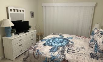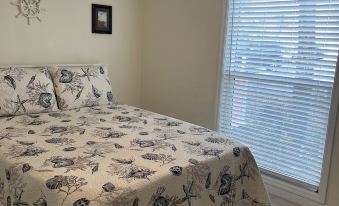 When you step into the primary bedroom, you’ll be reminded of the waves when you see the lovely shades of white and blue adorning the king bed. Place your clothes in the large dresser for convenient storage, and unwind before bed with a little entertainment on your own flat-screen TV. In the morning, you’ll awaken to a beautiful view of the sunrise through the large windows. The attached primary bathroom is spacious and clean, decorated in soothing neutral tones. Treat yourself to a bubble bath in the tub and soak away all your worries!