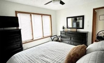 ★★★★★ Master Suite: The Queen bed master suite (accommodates 2 people) is entered on the main level. Your personal 35" 4K Roku Smart TV has all the streaming access as the living room for your viewing pleasure. The en-suite master bathroom features an oversized tile shower. All new. New mattress.