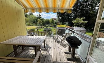 The balcony is offering a table and seating for up to 6 persons and direct view and access into the garden, where you are welcome to pay our cheerful chicken a visit ( no rooster !).