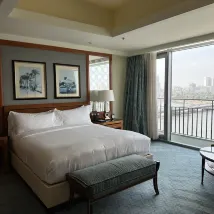 이 객실에서는 나일강의 경치를 감상할 수 있는데, 강 건너편에서 비치는 아침 햇살이든, 일몰이든, 밤이든 매우 아름답습니다. 바닥부터 천장까지 닿는 창문에 난간이 없으면 더 좋을 텐데요.