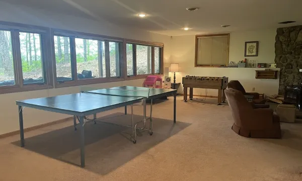 A welcoming home with lots of space and plenty of room for sleeping. We especially enjoyed the fireplace in the living room and the ping pong/foosball tables in the basement. The well appointed kitchen made prepping food for a group of 8 adults easy. The property is located on a private street, and had the weather been better we would have enjoyed hiking in the surrounding woods. We enjoyed our stay and would consider staying here again.