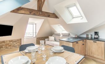 2-family house, 2 storeys, renovated in 2021. 2 apartments in the property. In the district of port de Cancale, in a quiet, sunny position, from the sea, 10 m from the beach. Short-stay parking zone (fee), Monday - Sunday. Supermarket 2.4 km, restaurant, bar 50 m, bakery 900 m, café 50 m, 5 minute walk to the centre, bus stop "Eglise" 1.3 km, sandy beach "Port mer" 4 km, thermal baths "Thermes marins de St Malo" 16 km. Sports harbour 50 m, golf course (18 hole) 25 km, riding stable 2 km. Nearby attractions: grand aquarium de Saint Malo 14 km, St Malo Intramuros 17 km, La pointe du grouin 5 km, Dinard 22 km, Dinan 25 km, Le Mont St Michel 48 km. The keys‘ handover takes place by the agency Interhome in Cancale. "Le point du jour 2", 2-room penthouse 40 m2 on 2nd floor. Comfortable and modern furnishings: large living/dining room, ceiling height 160 - 175 cm with 1 sofabed (90 cm, length 190 cm), TV (flat screen). 1 large room with 1 french bed (1 x 140 cm, length 190 cm). Open kitchen (dishwasher, 3 induction hot plates, toaster, kettle, freezer, electric coffee machine, combination microwave). Bathroom, sep. WC. Electric heating. Parquet floors. Very beautiful view of the sea. Facilities: hair dryer. Internet (WiFi, free). Please note: non-smoking house. Smoke alarm.