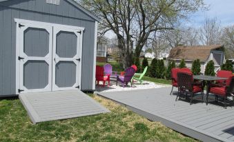 Outside there is a nice covered porch with rocking chairs in the front and a private backyard with a fire pit in the back.