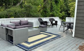 The location was lovelyAC's full of mold, lawn not mowed, patio furniture to filthy to use, deck furniture filthy, deck full of pine needles and spider webs, no chairs for the deck table, no cushions for wicker chairs on the deck. Edison yard lights didn't work, HUGE hole at the bottom of the back deck stairs, bottom step broken and dangerous. Not enough silverware, glasses, cups, plates for 10 guests. Not enough towels for 10 guests x 3 days, NO FACE CLOTHS. Grills were charcoal (undisclosed) not propane hence, we didn't bring charcoal or lighter fluid, washer & dryer were coin operated 4 a load not in unit (not disclosed) Downstairs shower filthy, doorknob in downstairs bathroom falling off, only two rolls of Toilet paper for downstairs bathroom (10 guests x 3 days). Bunk beds flimsy not suitable/safe for adult use; toddler okay, plethora of cobwebs throughout the house, High cleaning fee and it obviously wasn't cleaned. Be prepared to ***** beds, take the trash out, load and run the dishwasher! Owner essentially unresponsive to concerns. I would NOT recommend this place especially taking the price into consideration. I saved and saved to host my family for the 4th of July holiday and the place was a disaster!