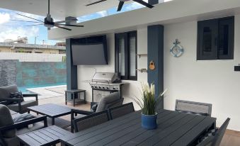 Welcome to your tropical retreat in Carolina, Puerto Rico, where style and comfort blend effortlessly. This unique 4 bedrooms, 2.5 bathrooms home offers a one-of-a-kind experience with its expansive private patio perfect for enjoying the coastal breeze in complete privacy. The serene outdoor space, furnished with cozy seating, TV, grill , hammock and a private pool which provides an ideal spot for morning coffee, al fresco dining, or simply unwinding after a day at the beach. The patio also features a half bathroom and an outdoor shower. A dedicated workspace can be found near the family room.