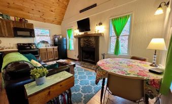 Tucked away behind the trees on the side of a mountain. 1 BR with a loft used as the 2nd BR and 1 full bath. Wrap around covered porch with porch swing, fire pit, picnic table, and moss covered bridge. About pets:Pets allowed: dogs (limit 2 total).Never leave dogs unattended unless in a crate..About checkOut:Check out before 10:00 AM.About children:Children allowed: ages 0-17.Please watch little ones with spiral stairs..About checkIn:Check in after 4:00 PM.About smoking:Smoking allowed: in designated areas.About minBookingAge:Minimum age to rent: 25.About events:No events allowed.